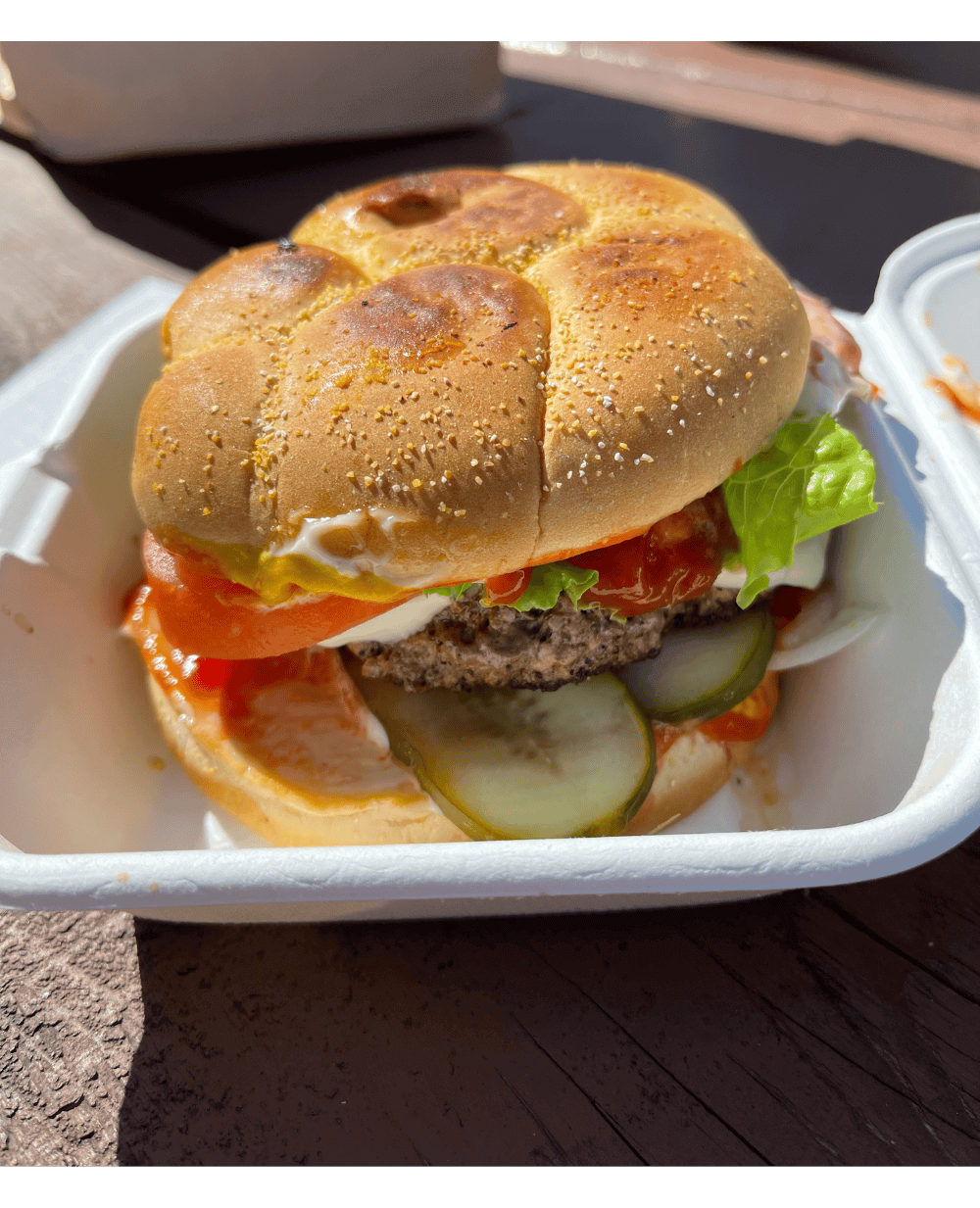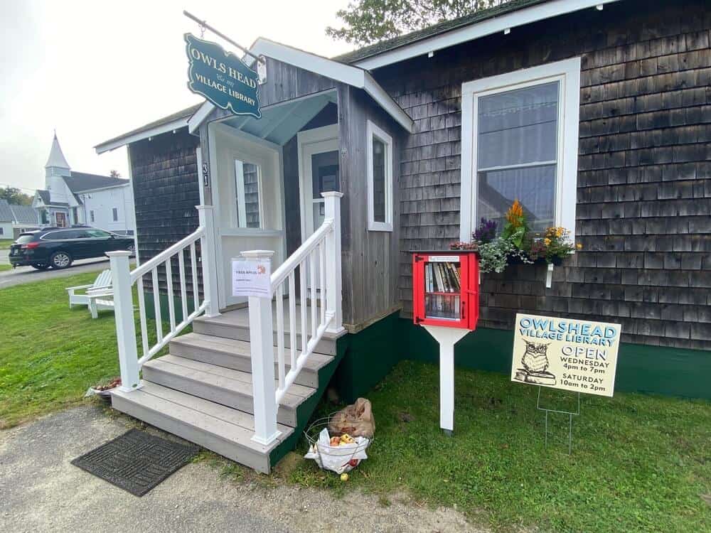 In the busting down town, we think we spotted a whopping total of three commercial spaces: the post office, the library (which is the size of a gnome house and was not open when we visited but they did leave a basket of free apples for passersby to begin the celebration of fall), and the Owl’s Head General Store. This fine little general store with outdoor patio seating has homemade foods and a Seven Napkin Burger made from actual ground beef. This item seems to be designed to increase their paper towel sales and one-hour dry cleaning service (They don’t really have a dry cleaning service but I do recommend you request a ”3 Napkin Burger” if you’re like us and not so saucy.).